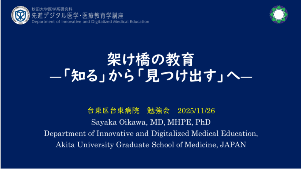 医学生の実習受け入れもされており、まさに卒前・卒後をシームレスにつなぐ医療者教育が行われています。当日は医学生・研修医・専攻医・医療スタッフの皆様に向けて医療者教育の話題提供をさせていただきました。日々の多忙な業務の中で多様な学習者に向けた教育を提供することは、並大抵のことではありませんが、講義終了後の質疑応答では、若い先生やベテランの方から鋭いご質問を頂き、同病院が医療者教育に真摯に向き合われている姿が垣間見れました。